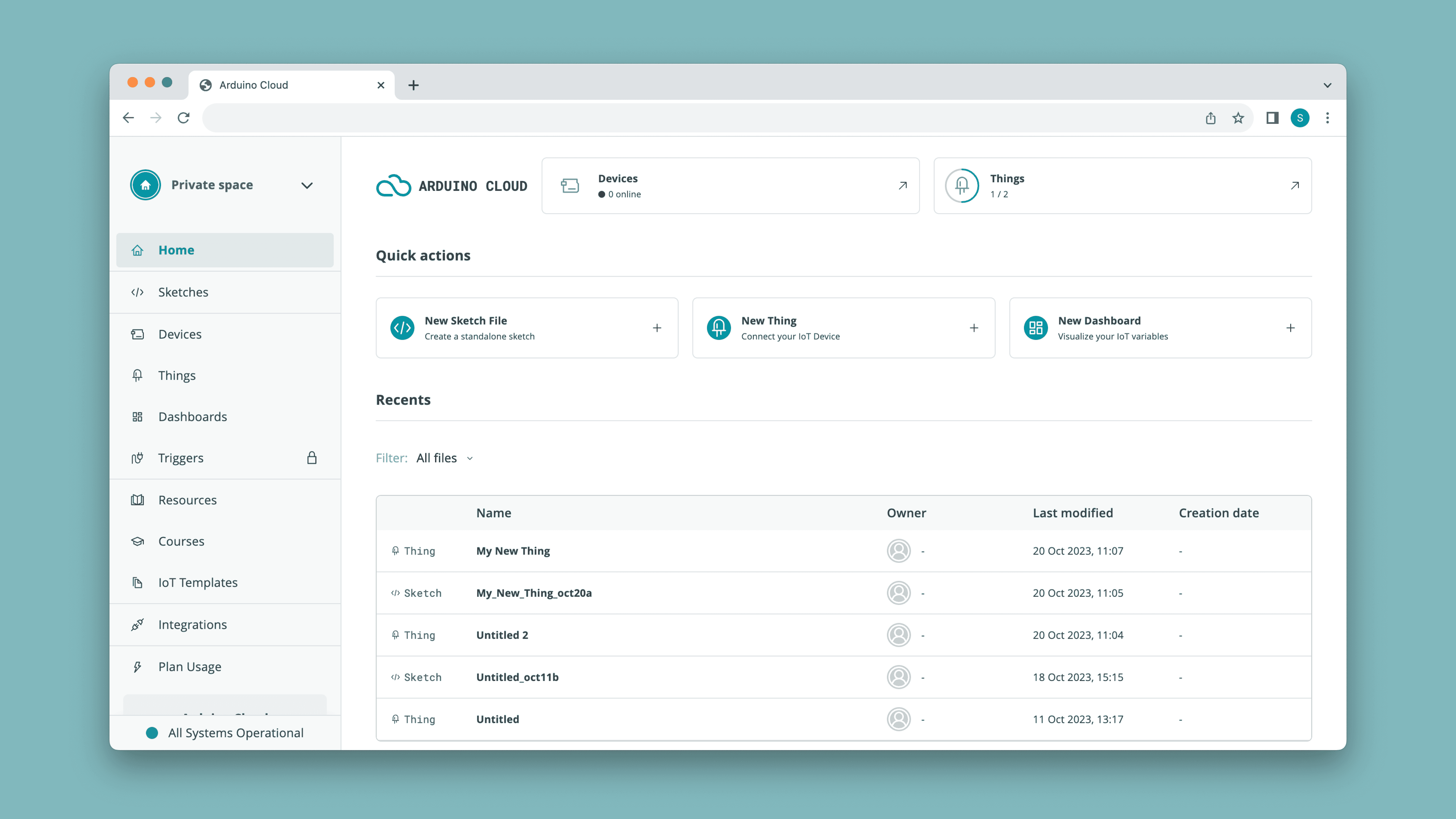 When working with your IoT projects, consider this the "main space" for configurations, as you can access your sketches from here as well.