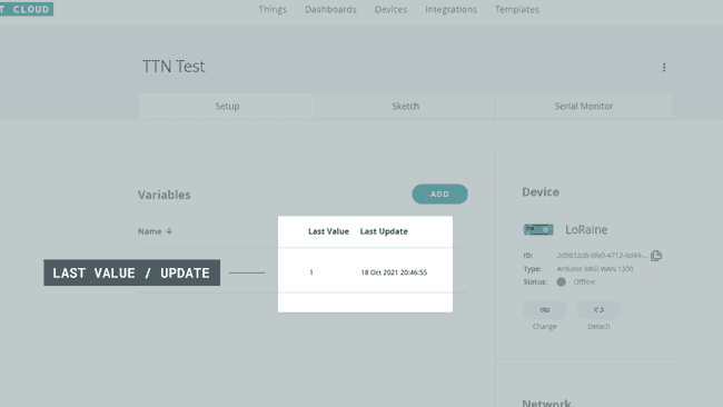4. Finally, we can upload the sketch to the board. After the upload, the board will start sending data via The Things Network, to the Arduino Cloud. We can check if we are receiving any data in the Things overview, under the "Last Value / Last Update" column.