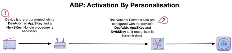 - Activation by Personalization (ABP): In this method, end-devices are personalized to work with a given LoRaWAN® network. End-devices are pre-provisioned with the NwkSKey and AppSKey and the 32-bits device network address.