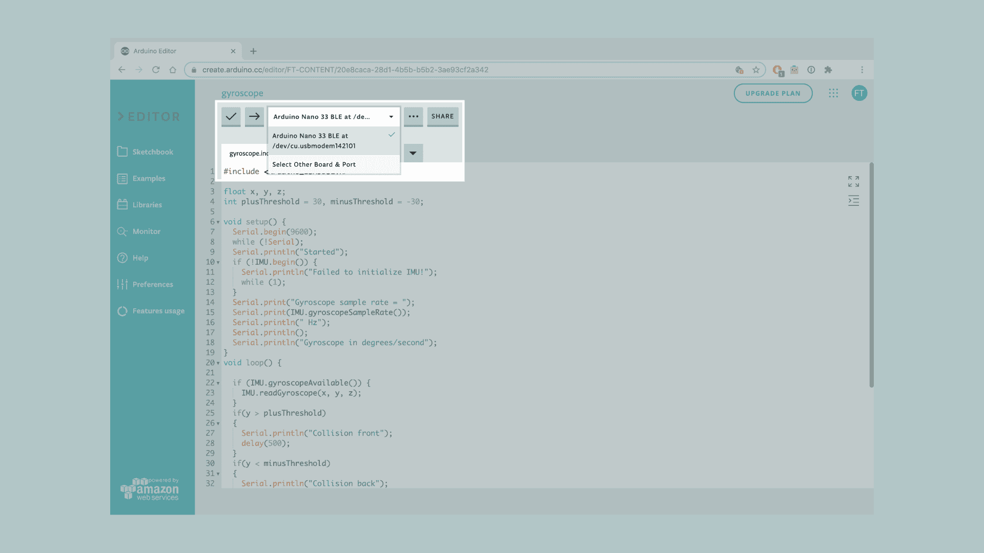 Now, connect the Arduino Nano 33 BLE to the computer and make sure that the Web Editor recognizes it, if so, the board and port should appear as shown in the image below. If they don't appear, follow the instructions to install the plugin that will allow the Editor to recognize your board.
