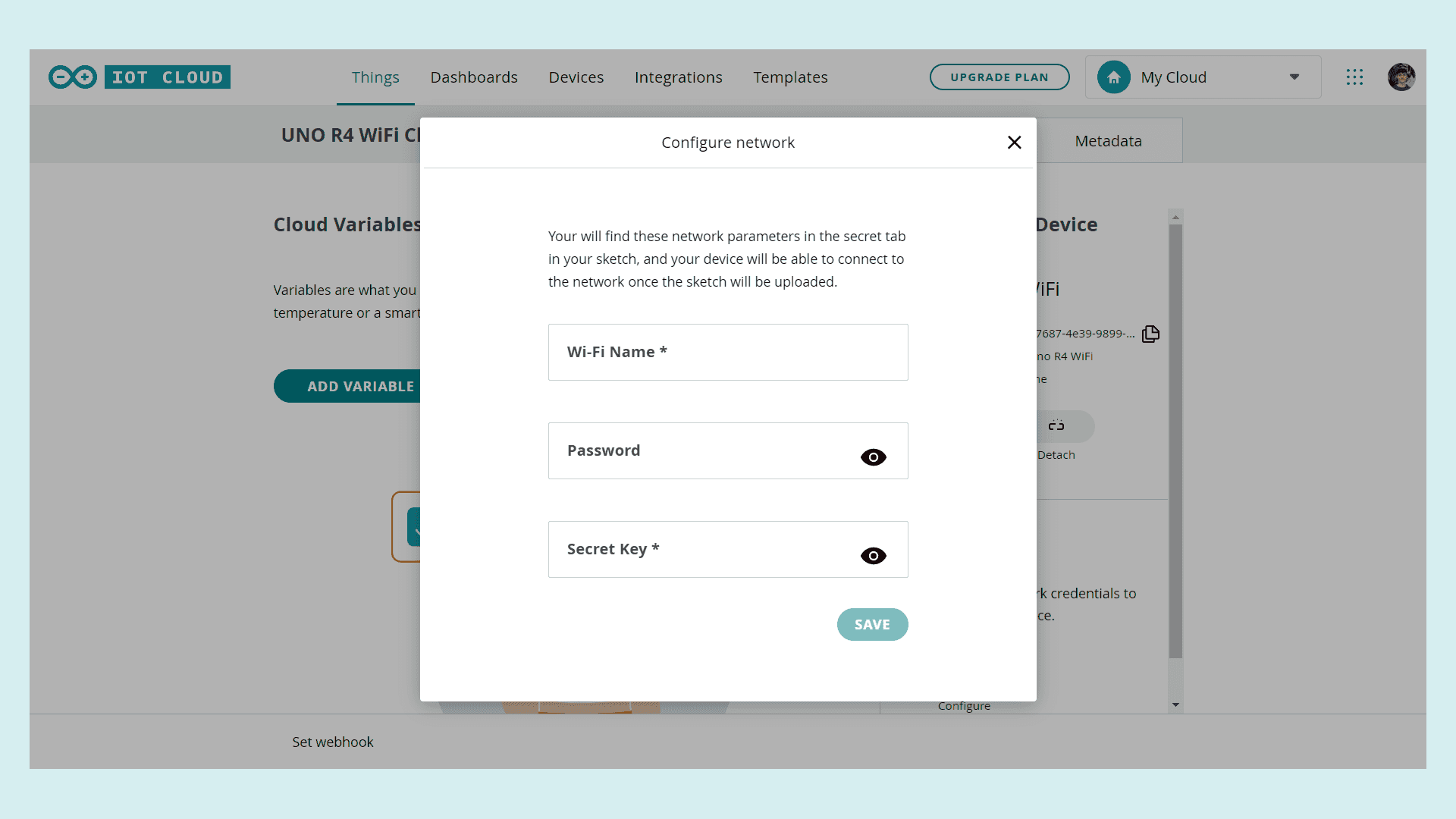 We are almost done with the setup. In the following step, you will need the secret key previously saved. Under Network click on configure and add your Wi-Fi credentials as well as your secret key.