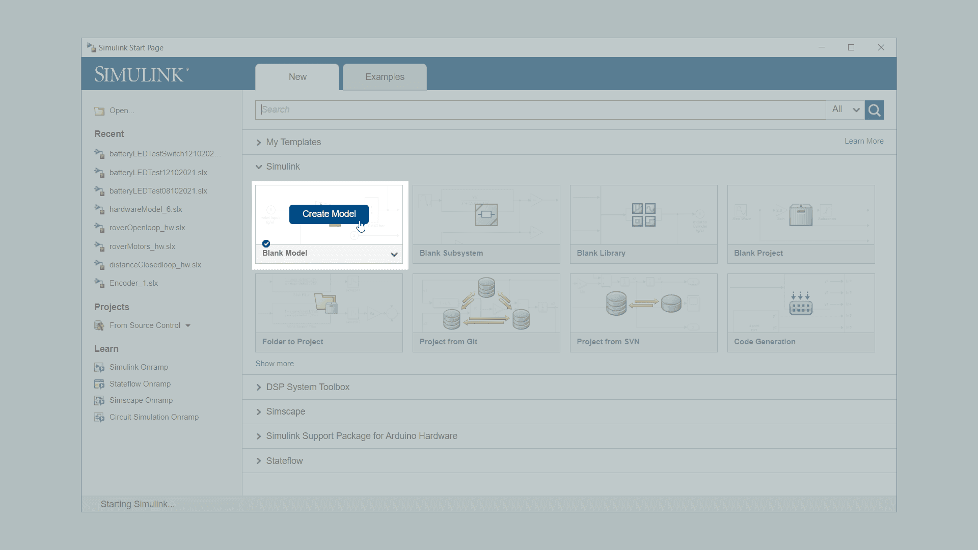 2. You will be greeted with the Simulink Start Page. Under Simulink, click on Blank Model to open up a new canvas.