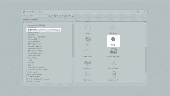 13. Simulink also has the option to use Dashboard blocks to visualize the state of the LED. You can find these blocks in the Library Browser, under Simulink->Dashboard. For the purposes of this tutorial, click and drag the Lamp block to the canvas.