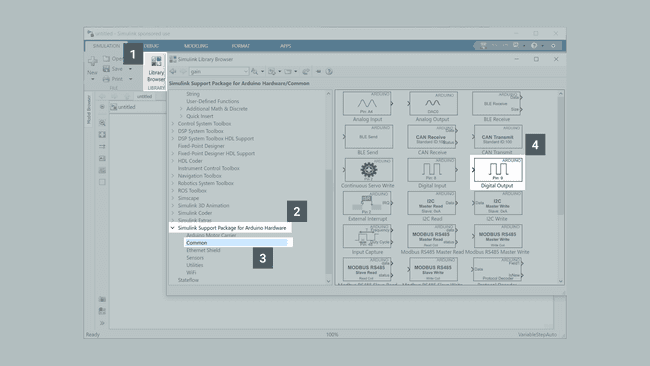 4. We can add blocks to do stuff, by selecting Library Browser from the Simulation ribbon. Under the Simulink Support Package for Arduino Hardware click on Common and add a Digital Output block. We will use this to control the LED on Pin 13.